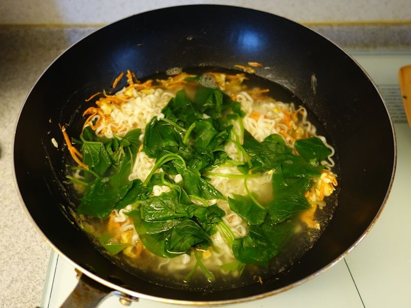 另一起鍋滾水烹煮五木肉燥味拉麵至七分軟硬,可加入調味料一包。