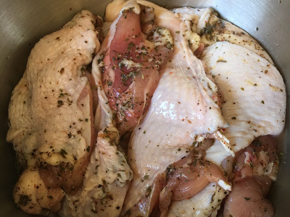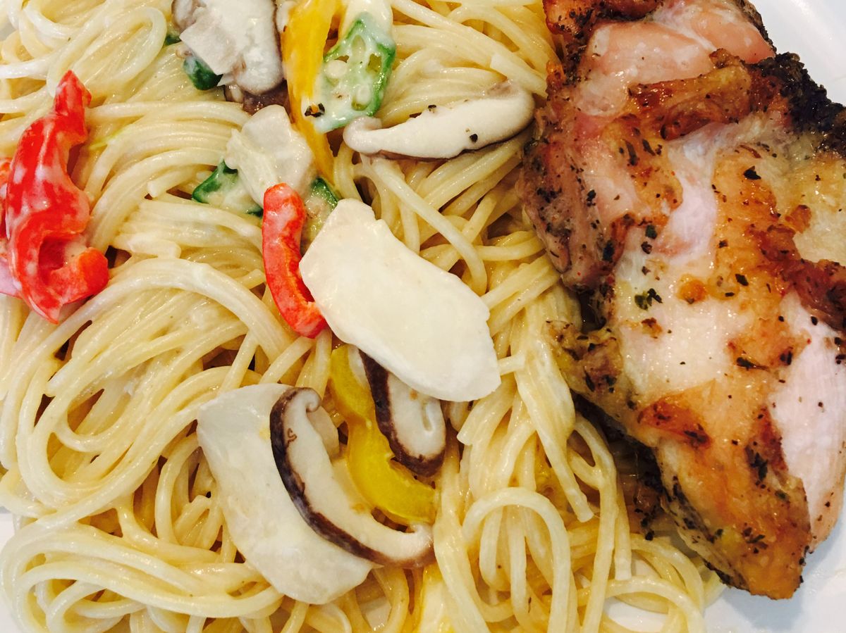 炎炎夏日 ,雞腿排誘人的色澤,搭配上鮮豔的時蔬,一盤香氣逼人的白醬義大利麵上桌了!