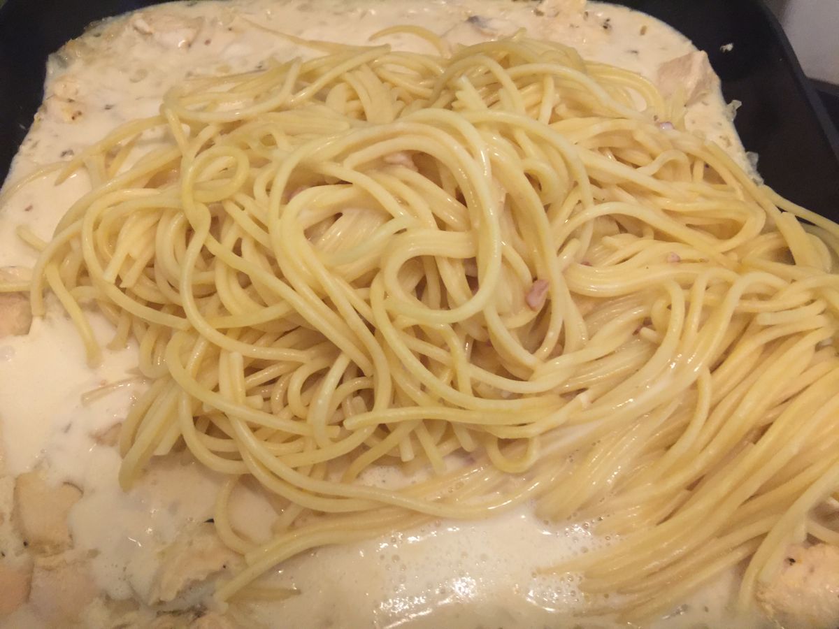 全部的食材都吸附濃郁的白醬,即可起鍋擺盤~