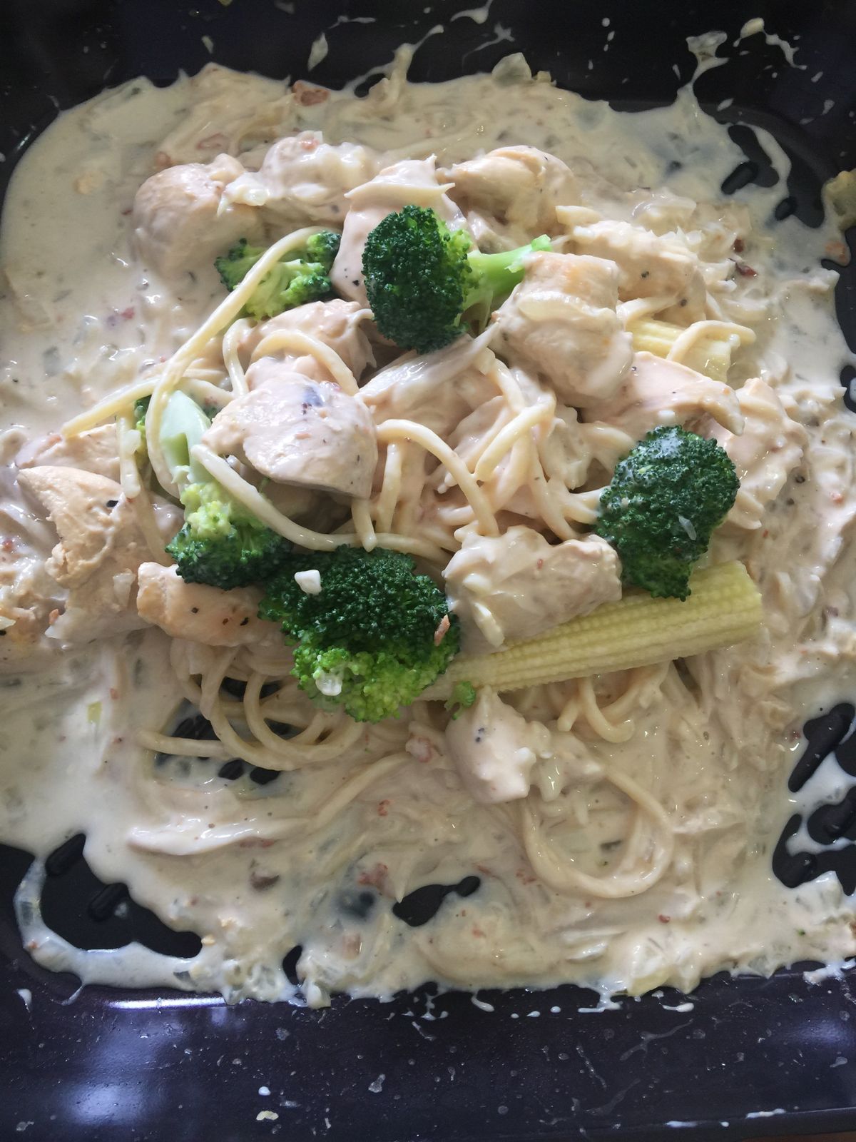 白醬義大利麵濃郁的奶香充滿口中,清爽的蔬菜和半熟的水波蛋完美的結合,原來幸福料理可以這麼簡單,快速烹調享受美好時光😘