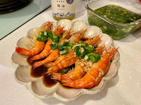 蒸好的蝦取出